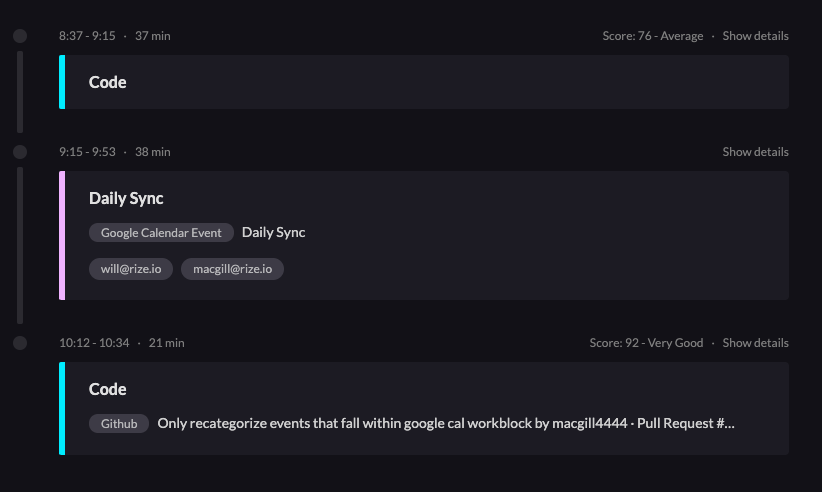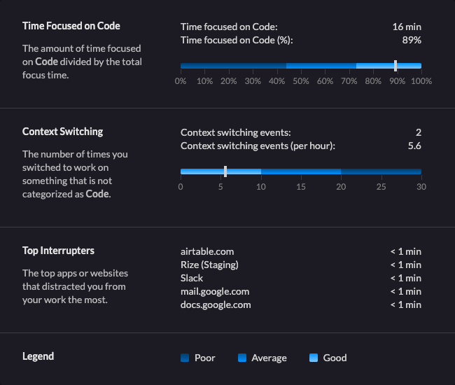 Focus Time Details - You can click on “Show Details” in the corner of every focus and meeting time in the Vertical Timeline. If it’s a focus time, you’ll see a section that breaks down how focused you were, how much you were context switching, and what the top interrupting sites and applications were.