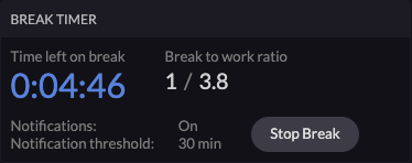 Break Timer - You can manually start breaks now! The break timer will also show you the last time you took a break. These breaks will count towards improving your break score and are perfect if you want to take a break without leaving the computer. You can set the default break time in your settings.