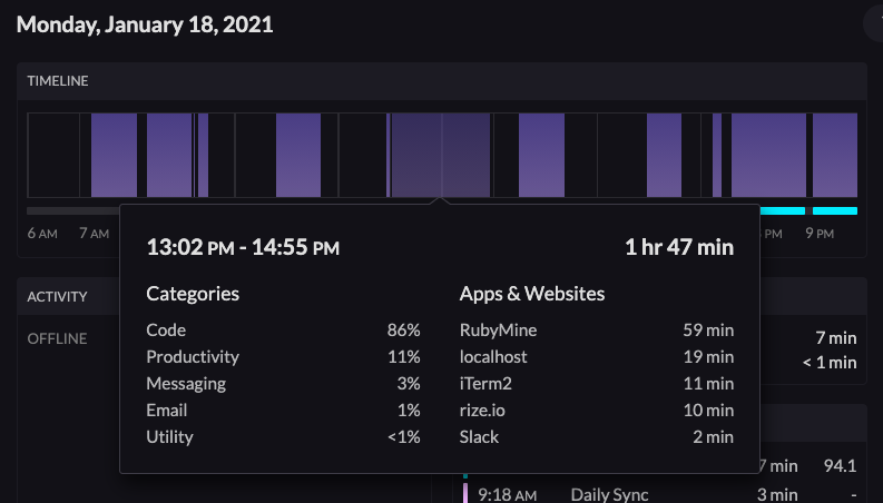 Interactive Timeline - If you hover over specific timeline events, you can see the time break by category as well as by websites and applications.