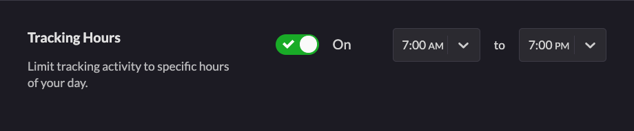Auto-Tracking Schedule - We added the ability to set up a tracking schedule for Rize. If you head to your settings, and find the section titled “Tracking Hours”, you can select a start and end time for Rize to automatically enable and pause tracking.