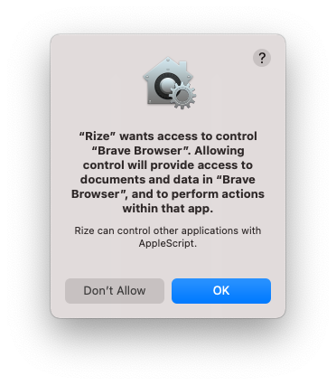 You need to approve the Automation permission for Rize for each of these browsers in order to get this functionality. You should be prompted immediately when opening the browser for the first time. Click “OK” and you should be all set.